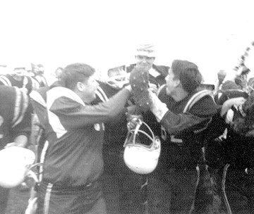 Jerry Church, John Driver and Charlie Brown carry Coach LaValley after beating Brussels in first game of the 1968 season.